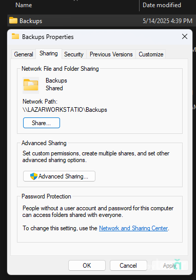 ✅ Now, your folder is shared and can be accessed over the network. It will be visible under the